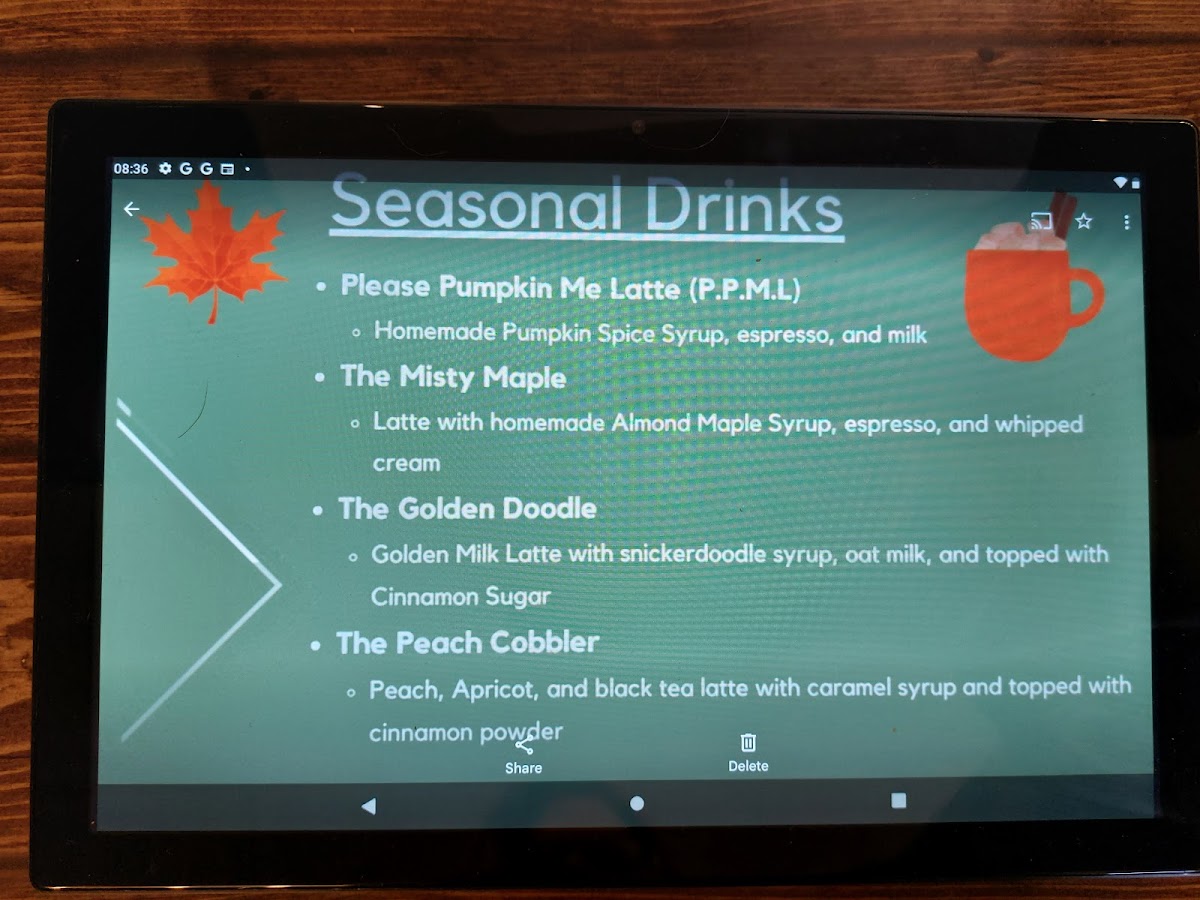 The menu also includes a unique touch with Cinnamon Powder, which can be sprinkled on your drink for added flavor. Each option on the menu provides a chance to explore various coffee and beverage styles, all with something to cater to every taste, from rich espressos to refreshing iced options. Whether you're stopping by for a quick espresso or settling in for a leisurely tea, Castle Coffee offers an experience for every preference.